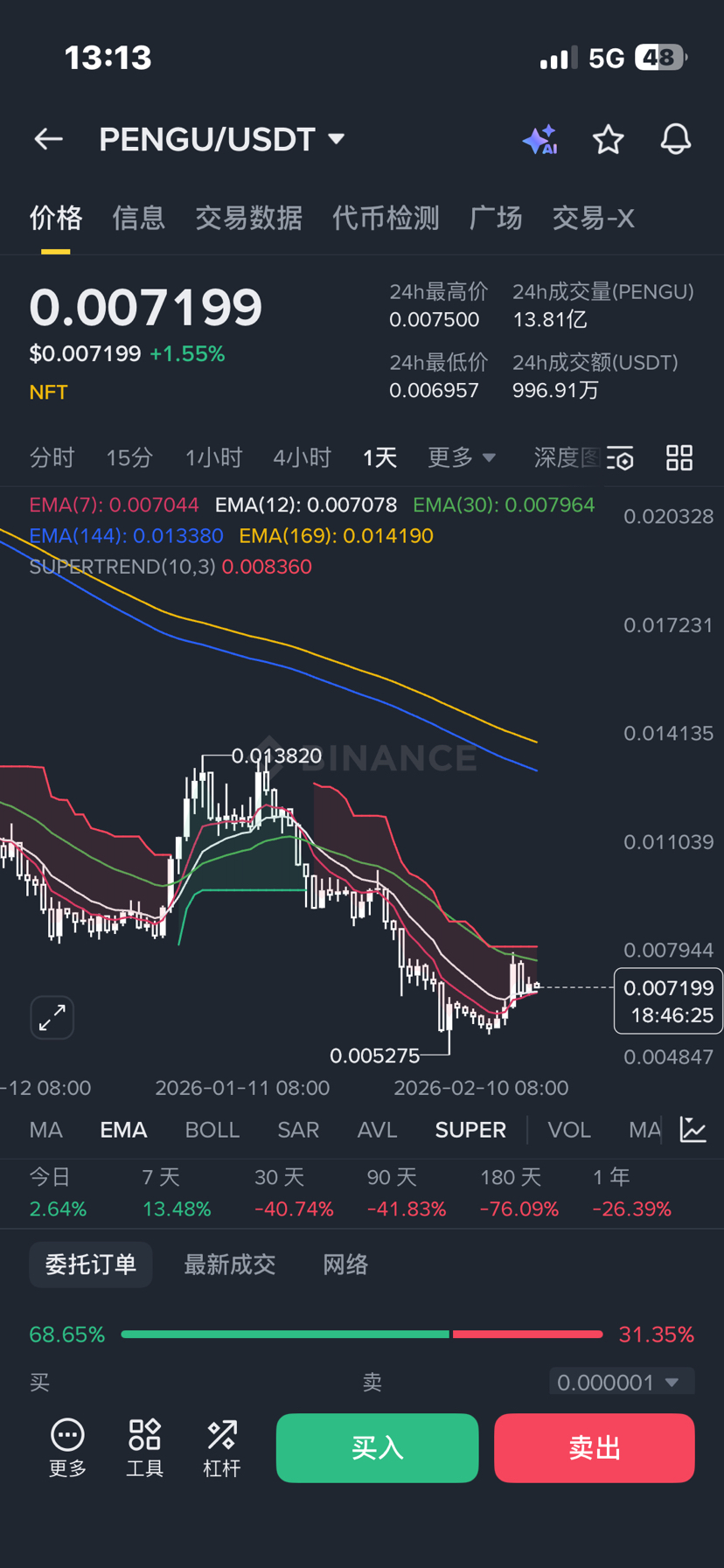 • Binance(PENGUUSDT):0.007219 USD(24h +1.49%)