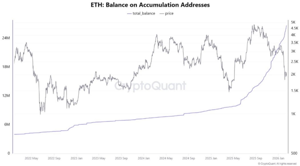 Even as ETH retraced, accumulation addresses absorbed more than 2.5 million ETH in February alone. Total holdings across these wallets now stand at 26.7 million ETH, up from roughly 22 million at the start of 2026.