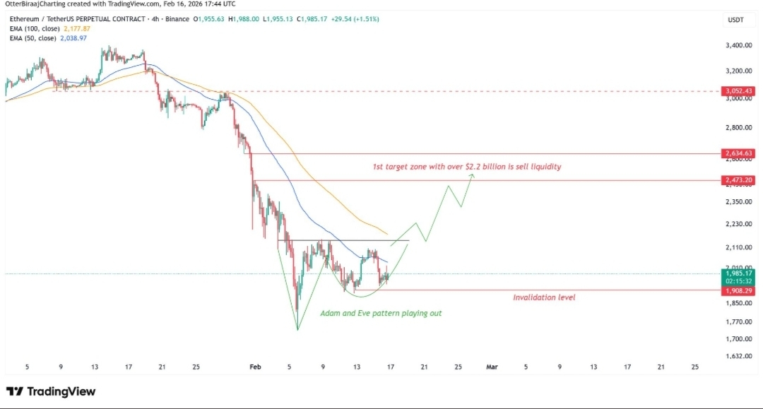 On the 4-hour chart, ETH is carving out an Adam and Eve bottom a classic bullish reversal structure. The sharp sell-off (Adam) was followed by a slower, rounded base (Eve), signaling that aggressive selling has given way to controlled accumulation.