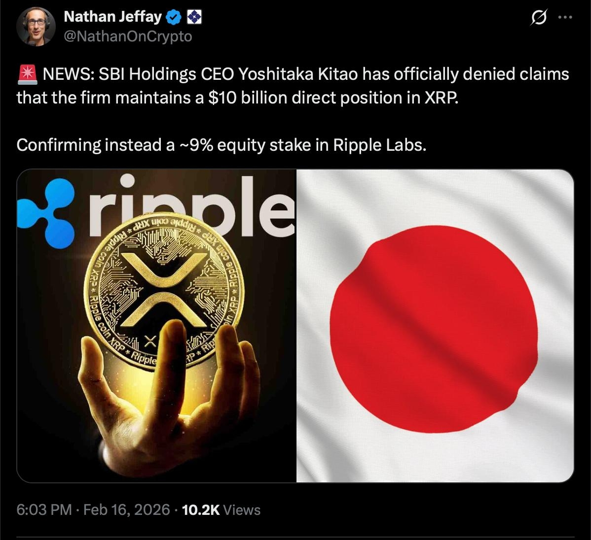 SBI Holdings Chief Executive Officer Yoshitaka Kitao has denied reports that the Japanese financial group maintains a $10 billion direct position in XRP, clarifying instead that the firm holds an equity stake of roughly 9% in Ripple Labs.