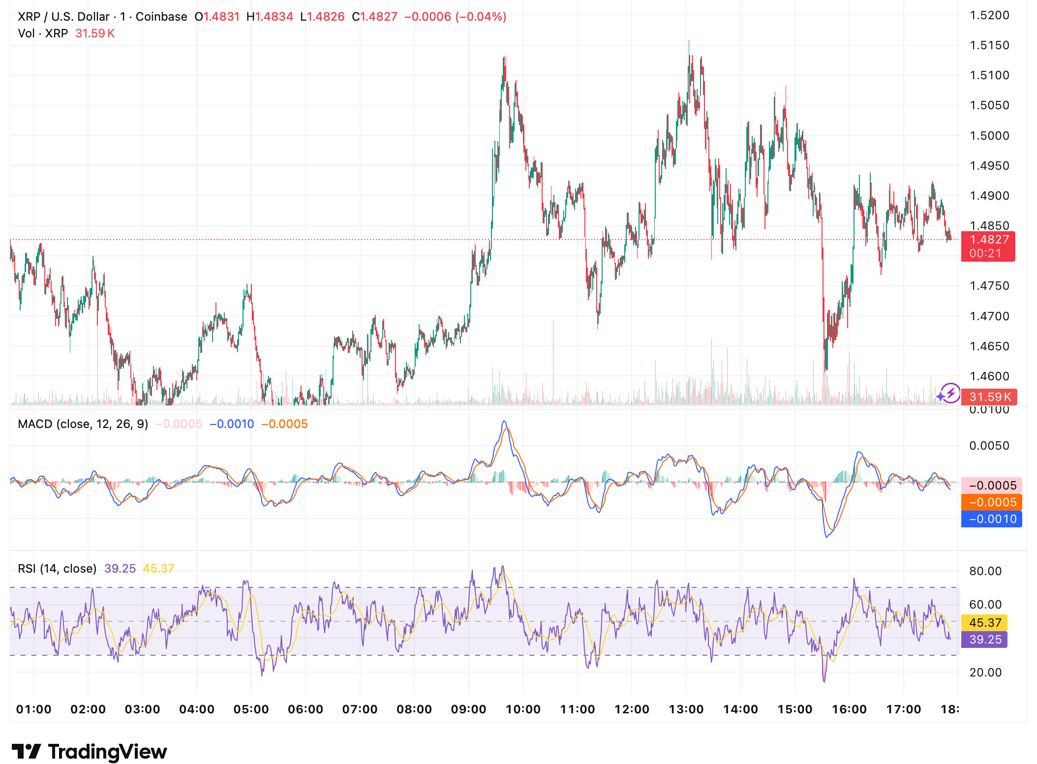 Аt the time of writing XRP was trading around $1.4827, down slightly on the session, as price action continued to consolidate within a tight intraday range.