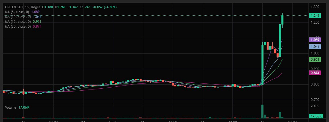 ORCA только что совершила массивный скачок, поднявшись более чем на 60%, с ценой, увеличившейся с $0.775 до $1.239. В то же время объем торгов взорвался на 150%, сигнализируя о агрессивном участии, а не о тонком всплеске ликвидности.