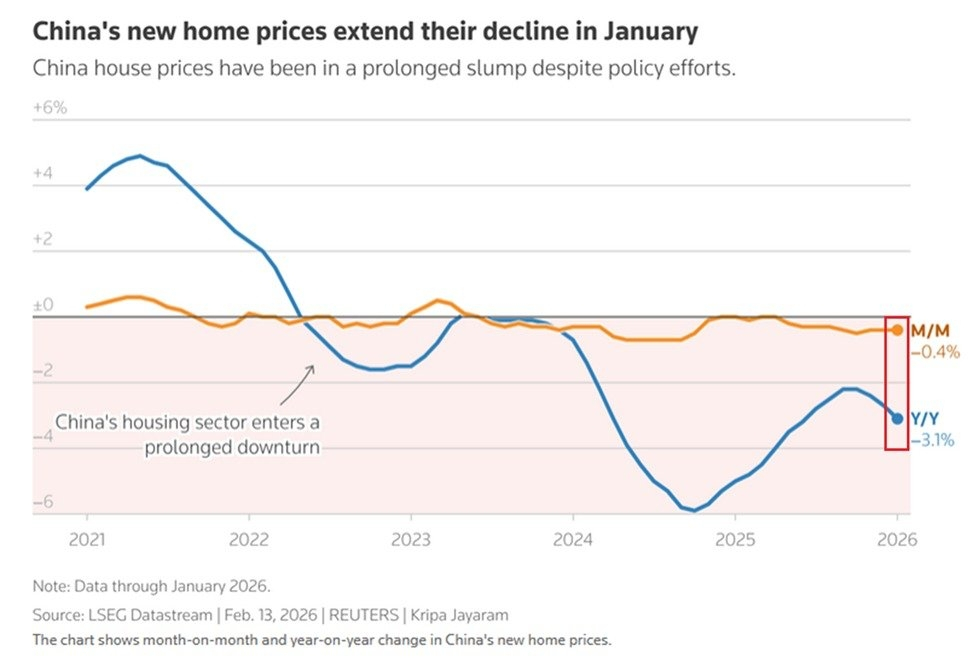 ​This data dismantles the hope for a "V-shaped" recovery. When prices in tier-one cities—historically the "safe havens" of Chinese wealth—are crashing by nearly 8% a year, the psychological damage to the Chinese consumer is immense. Real estate accounts for roughly 70% of Chinese household wealth. A decline of this magnitude is a massive negative wealth shock that explains why consumer confidence and spending are so depressed. We are witnessing the deflation of the largest credit bubble in history, and "buying the dip" has been a losing trade for half a decade.