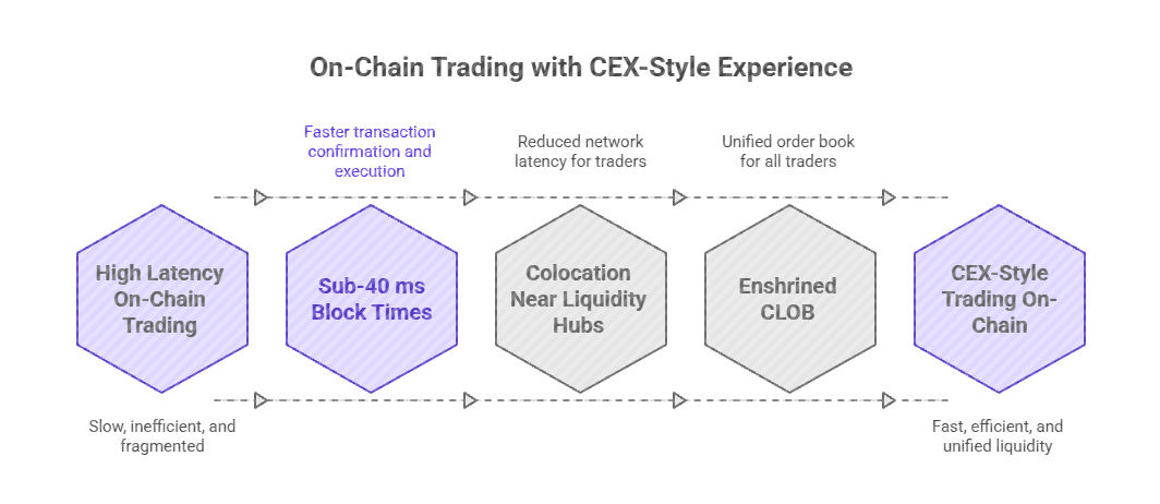Sub‑40 ms block times, colocation near major liquidity hubs, and an enshrined CLOB aim to give CEX‑style latency, cancel‑priority and unified liquidity, but with self‑custody and open infrastructure.