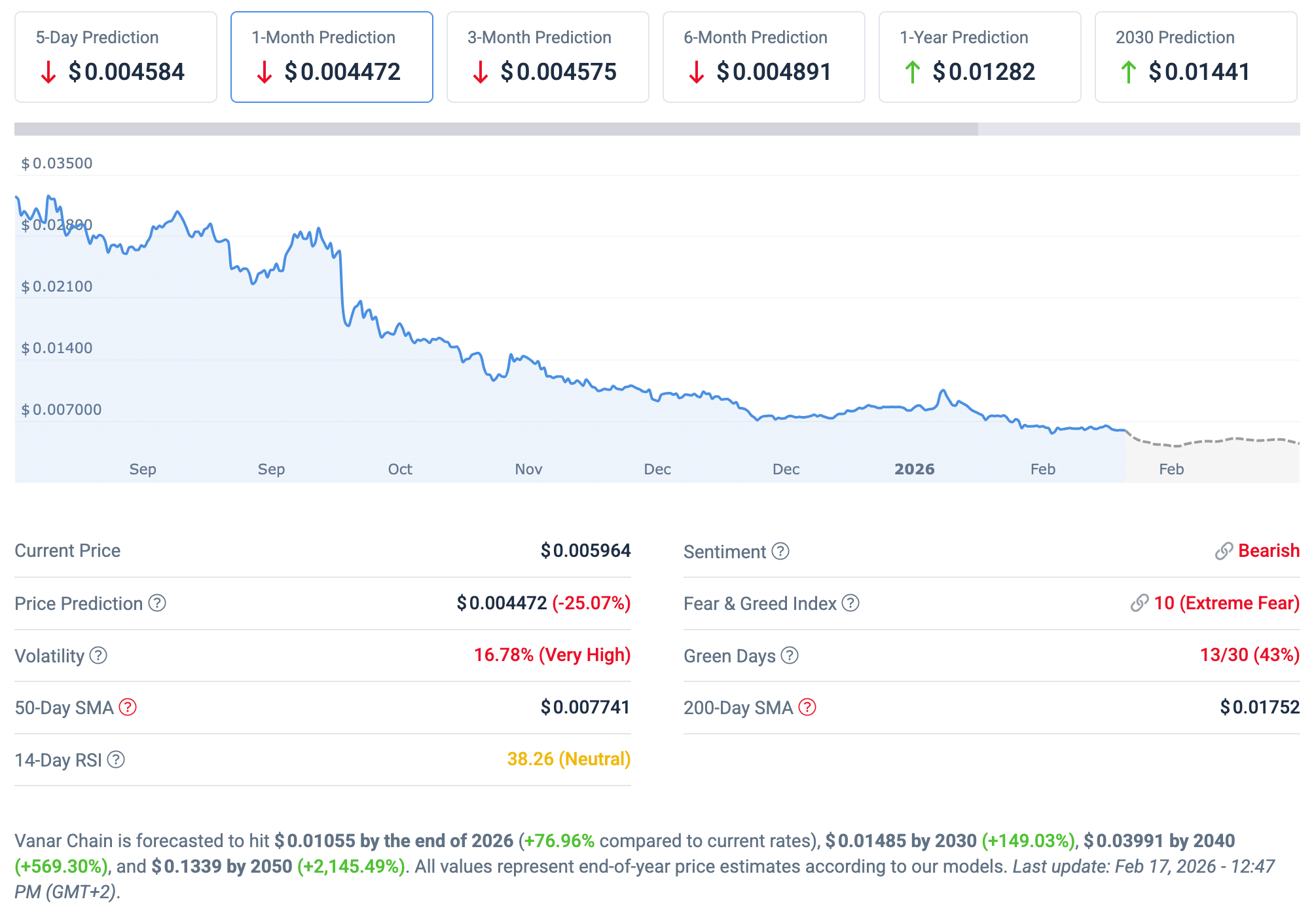 CoinDCX більш оптимистично дивиться на судьбу токену. Згідно з їх розрахунками в 2026 році мінімальна ціна $VANRY складе $0.009, середня - $0.0115, максимальна $0.0140: