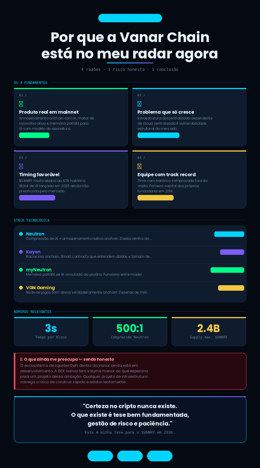 O que eu posso dizer é que quando analiso os critérios que uso para identificar projetos com fundamento real — produto funcionando, equipe com track record, problema crescente, timing de mercado ainda favorável para entrada — a Vanar passa em todos.