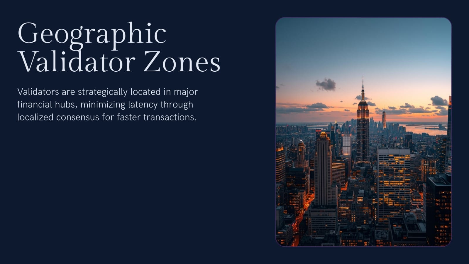 The validators belong to geographic areas (New York, Tokyo, London). Local agreement occurs locally and is then propagated around the world - reducing round trip latency drastically. It is the TradFi is the follow-the-sun model.