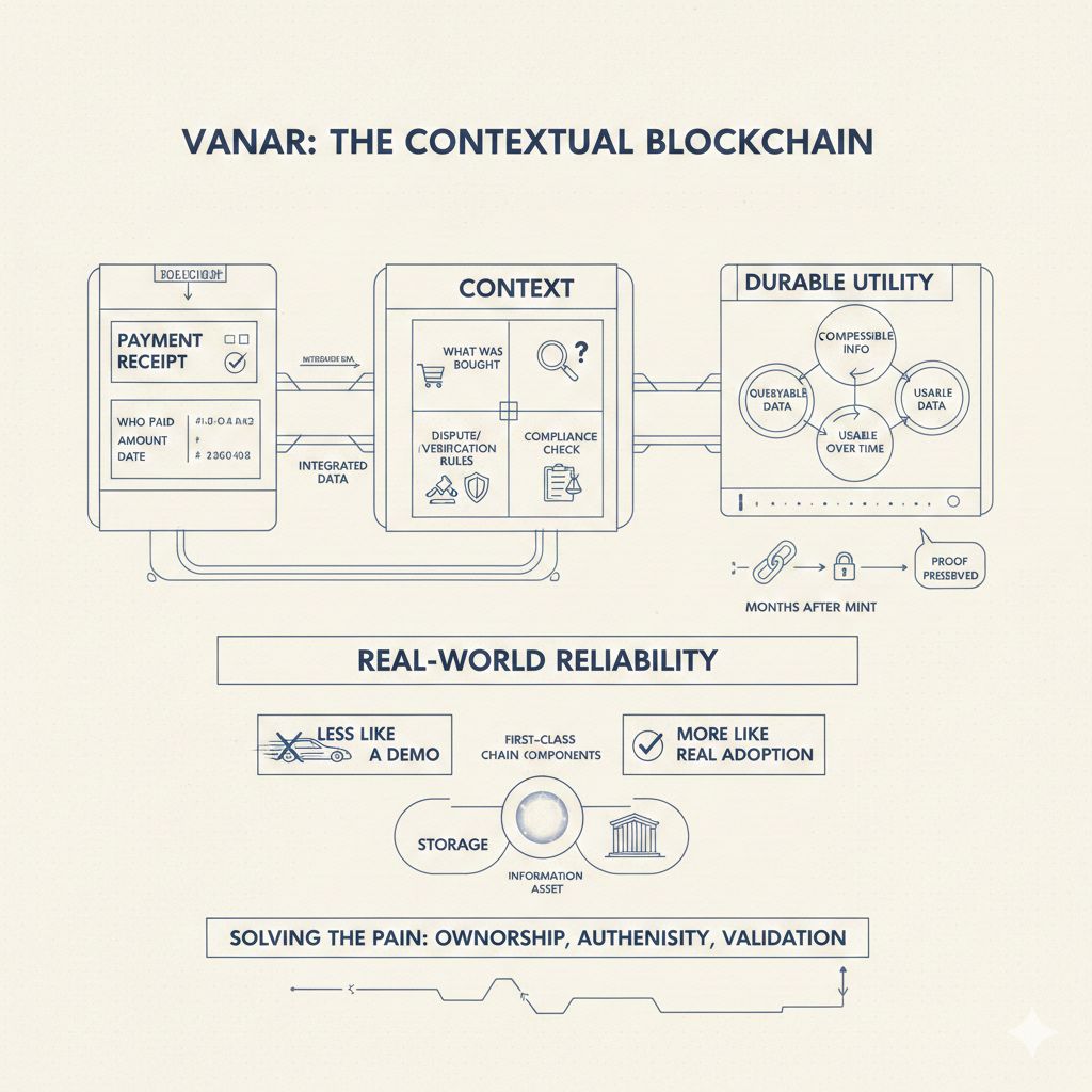 I explain Vanar best when I stop calling it “an L1” and start describing what it feels like in real life. Most blockchains act like a payment receipt. You can prove something happened, but the useful context is scattered elsewhere. Vanar is trying to keep the receipt and the context together, so the chain can hold not only who paid, but what was bought, why it matters, and what rules should apply later if there is a dispute, a verification request, or a compliance check. That is the kind of detail that makes Web3 feel less like a demo and more like something a normal person can rely on.