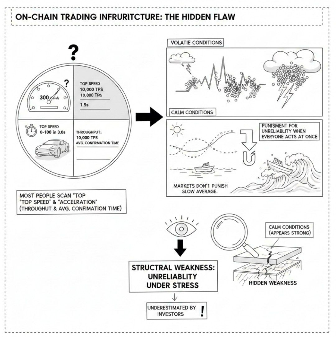 They scan the top speed number, glance at the acceleration, and assume the rest will take care of itself. In crypto, that spec sheet is throughput and average confirmation time. The problem is that markets do not punish you for being slow on average.