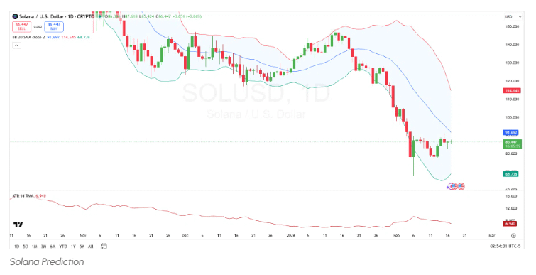 On the daily chart, Solana is facing immediate resistance near the $91.69 level, as indicated by the middle band of the Bollinger Bands indicator. The price is currently moving towards this band, while the upper band is above at $114.65, indicating that the price is still well below its breakout levels.