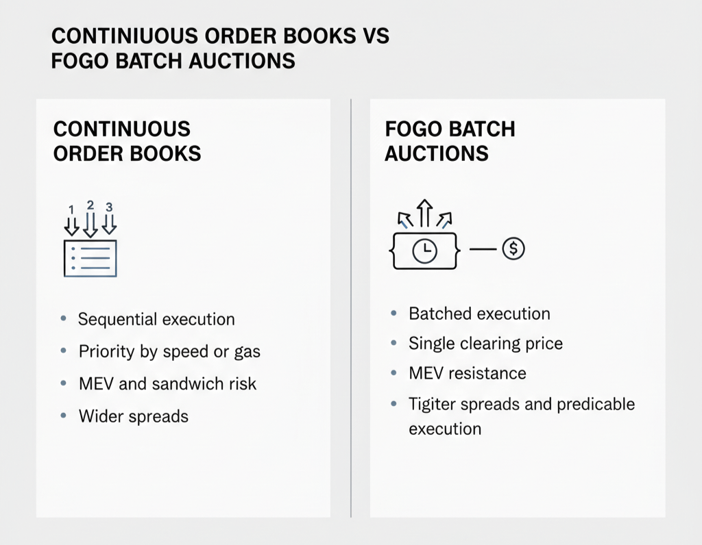 When I first examined how Fogo handles trade execution, the economics became immediately clear. Traditional order books process transactions continuously in the order they arrive. First transaction gets executed first. Sounds fair until you realize that "order of arrival" on a blockchain means whoever pays more gas or has better connections to validators gets priority. That creates the MEV problem—bots sandwich your trades, front-run your orders, extract value from the sequencing itself. Every major DEX deals with this because continuous order books make MEV mathematically inevitable.