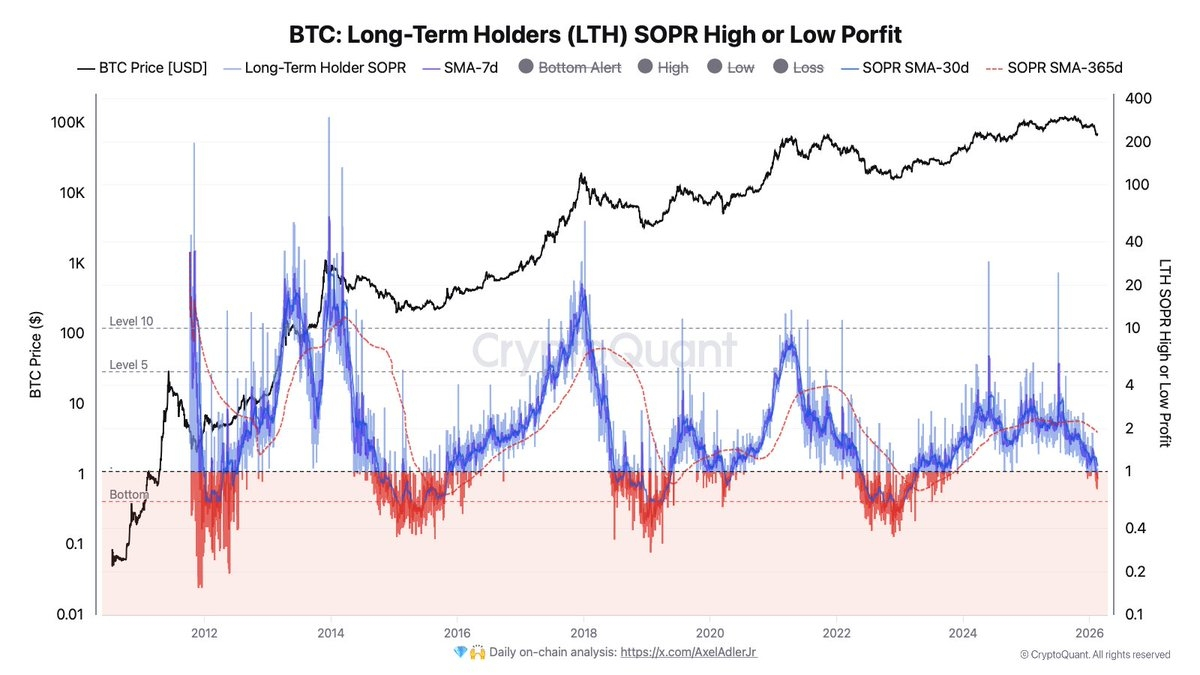 The Long-Term Holder SOPR - a metric that shows whether long-term investors are selling in profit or at a loss - has just dropped below 1, currently sitting at 0.88. When this indicator falls below 1, it means long-term holders are, on average, selling Bitcoin at a loss.