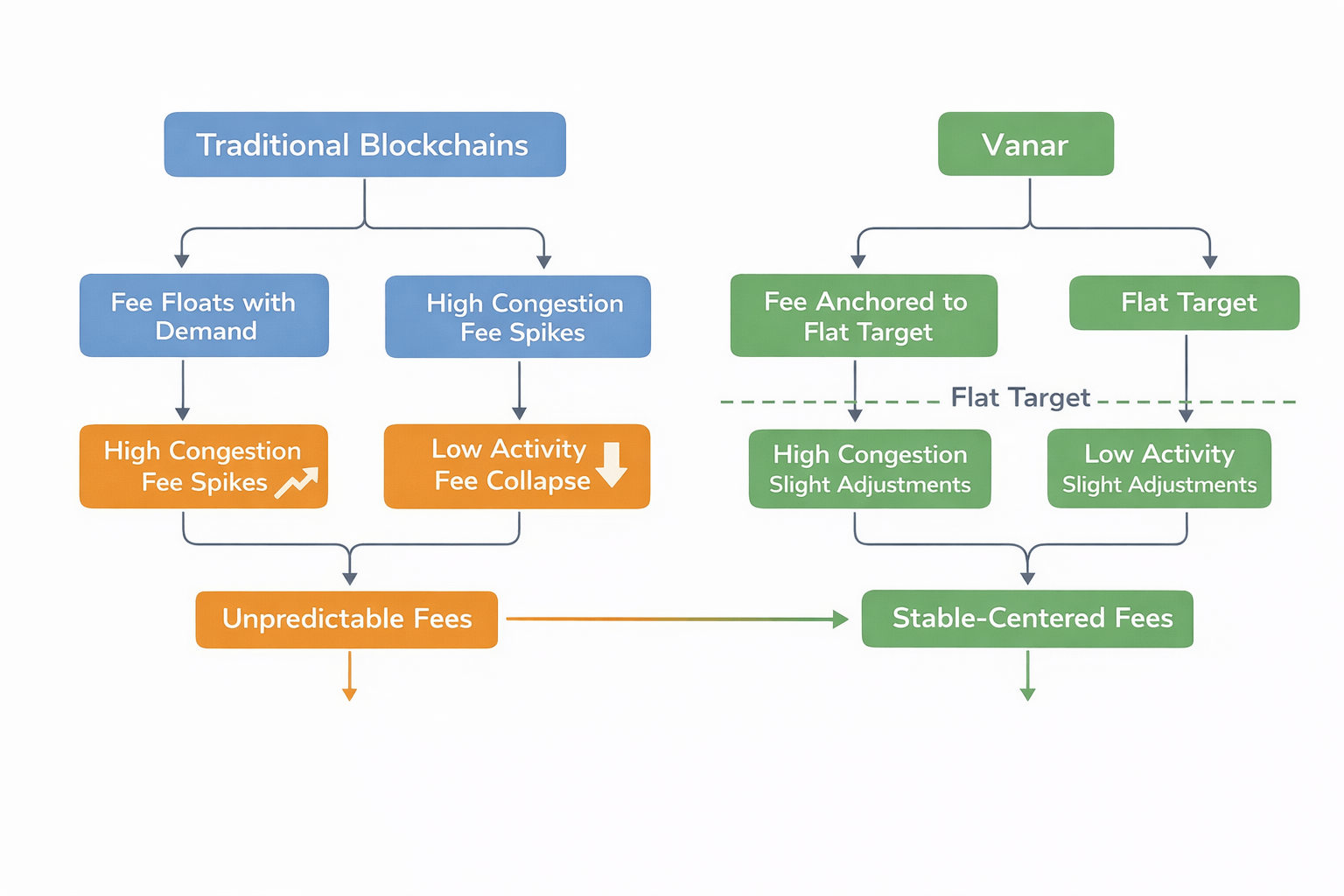 Instead of letting fees float purely with short-term congestion, it anchors them to a flat target a reference cost level the network aims to maintain under normal conditions. That target doesn’t mean fees never change. It means they’re guided toward a stable center rather than drifting freely with every demand fluctuation.