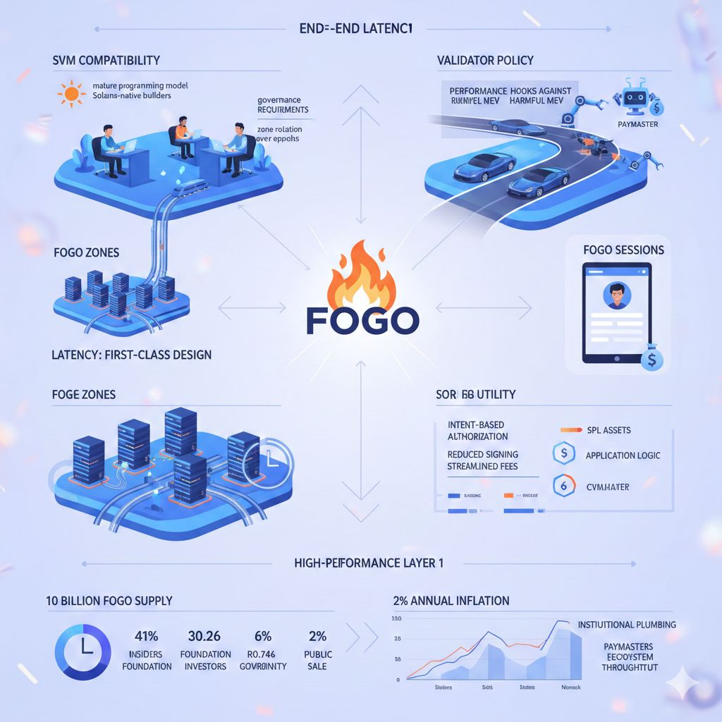 Fogo is built around a blunt observation: on-chain trading doesn’t feel “fast” just because a VM is fast. The experience is defined by end-to-end latency—how quickly a transaction propagates, how deterministically it lands, and how reliably the network keeps that pace when markets get chaotic. Fogo positions itself as a high-performance Layer 1 that stays compatible with the Solana Virtual Machine, but treats latency as a first-class design constraint across networking, validator operations, and user flow, not a side effect of good engineering.