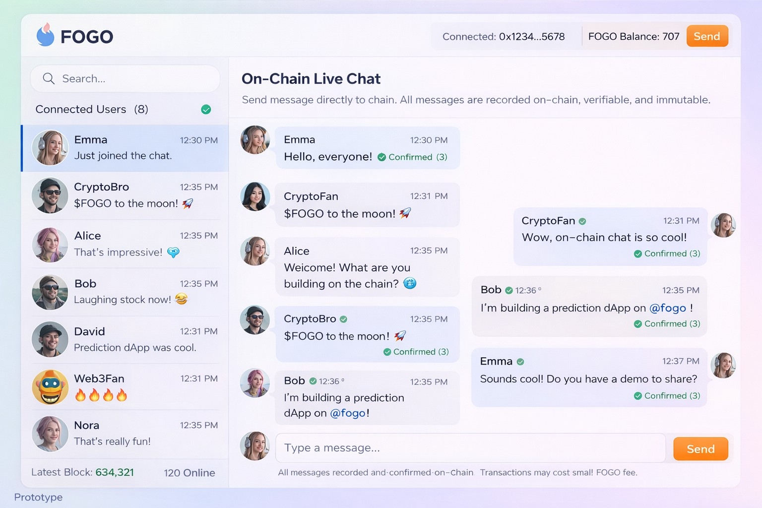 在 $FOGO 上,這些問題相對可控。高效能架構讓小額高頻交易成為可行模式,使「鏈上社交」不再只是概念。這種聊天室甚至可以進一步延伸為 DAO 討論區、鏈上投票留言板、NFT 社群頻道等應用。