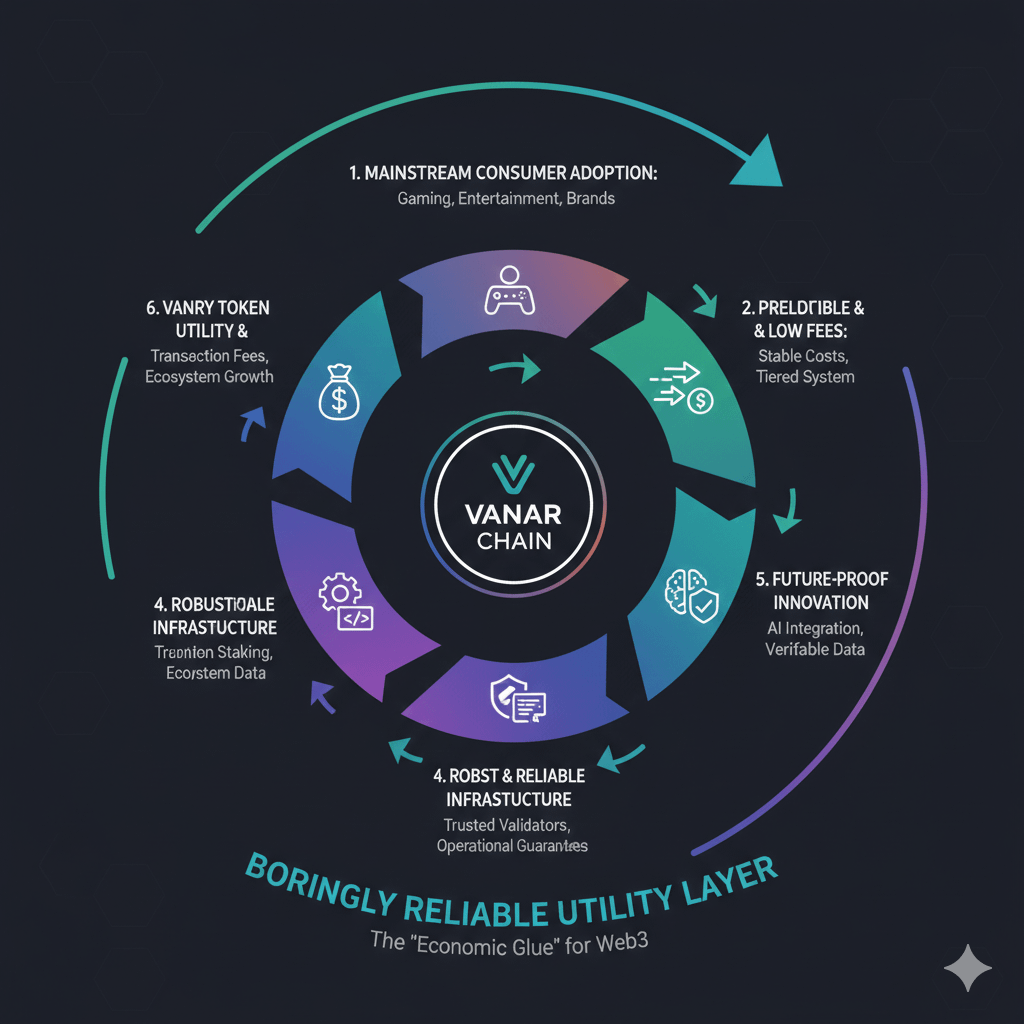 The most insightful way to evaluate Vanar isn’t by asking whether it can outcompete every L1 on raw decentralization or hype cycles; it’s by asking whether it can become boringly reliable for the industries it’s targeting. If Vanar succeeds, the VANRY token’s role becomes naturally reinforced: it’s not just fuel for speculative trading, it’s the economic glue for a network that developers can build on confidently and that brands can deploy into without worrying that the user experience will collapse the moment market conditions change. That’s the real bet—turning Web3 infrastructure into a predictable utility layer that consumers never need to notice, while still giving builders and ecosystems the incentives and performance they require to scale.