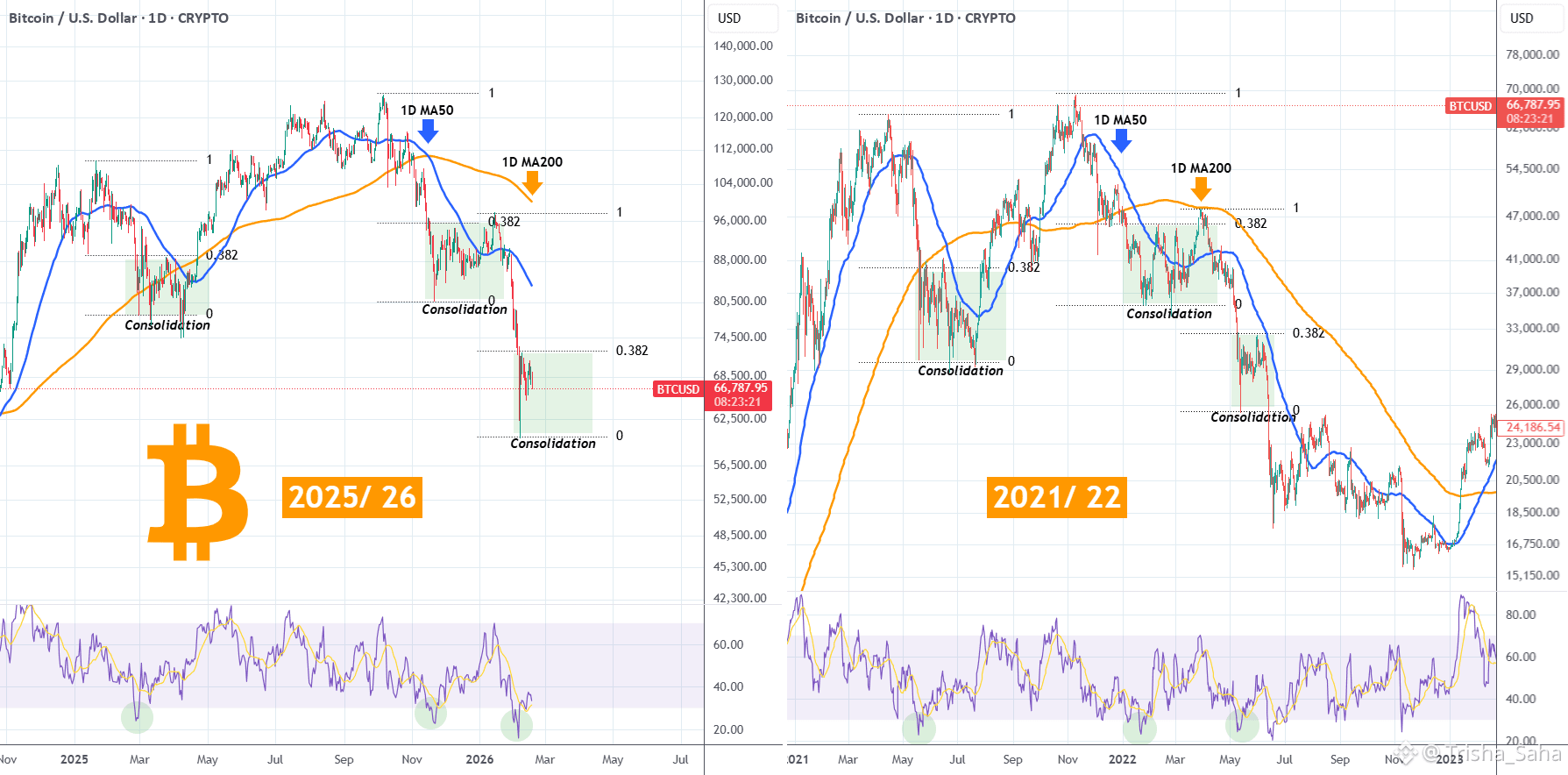 Bitcoin is currently replicating the Bear Cycle of 2022. Every time the Weekly RSI turns oversold (dropping below 30.00), BTC enters a lengthy "hibernation" phase.