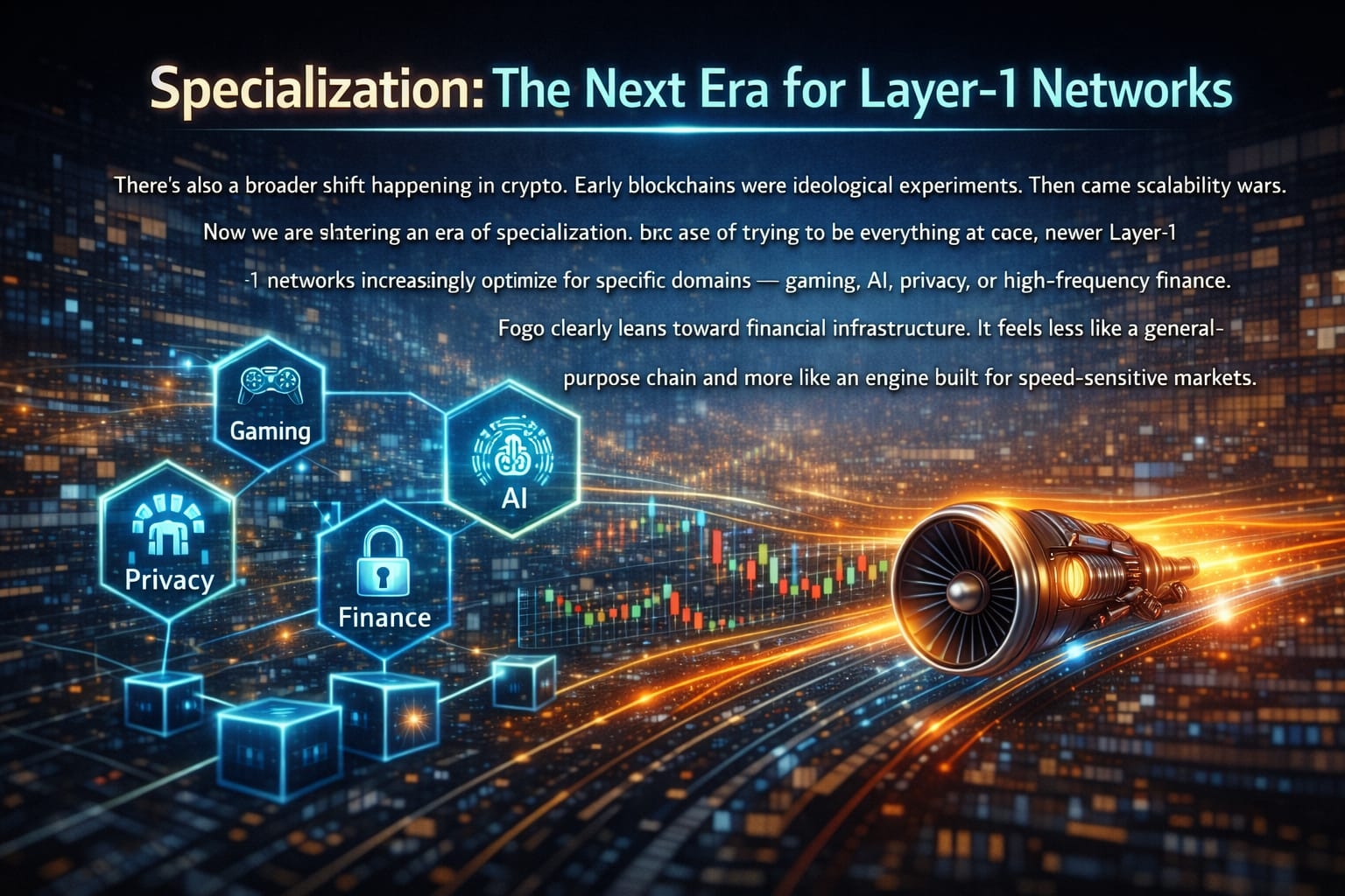 There’s also a broader shift happening in crypto. Early blockchains were ideological experiments. Then came scalability wars. Now we are entering an era of specialization. Instead of trying to be everything at once, newer Layer-1 networks increasingly optimize for specific domains — gaming, AI, privacy, or high-frequency finance. Fogo clearly leans toward financial infrastructure. It feels less like a general-purpose chain and more like an engine built for speed-sensitive markets.