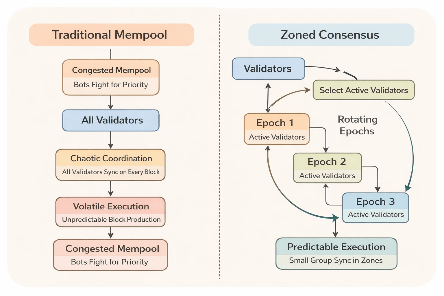 Fogo’s zoned consensus is presented as where execution meets engineering realism. Rather than requiring every validator to coordinate on every block–regardless of physical latency constraints–the design is structured around rotating active participation across epochs. A smaller, geographically aligned validator group can handle live execution within each epoch, aiming to reduce propagation noise and tighten block-time variance.