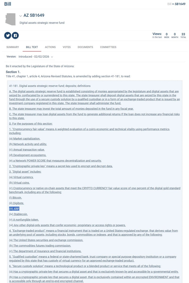 في خطوة قد تمثل سابقة تنظيمية على مستوى الولايات، يظهر مشروع القانون Arizona SB1649 المقترح في ولاية Arizona إنشاء صندوق احتياطي استراتيجي للأصول الرقمية والمفاجأة؟
