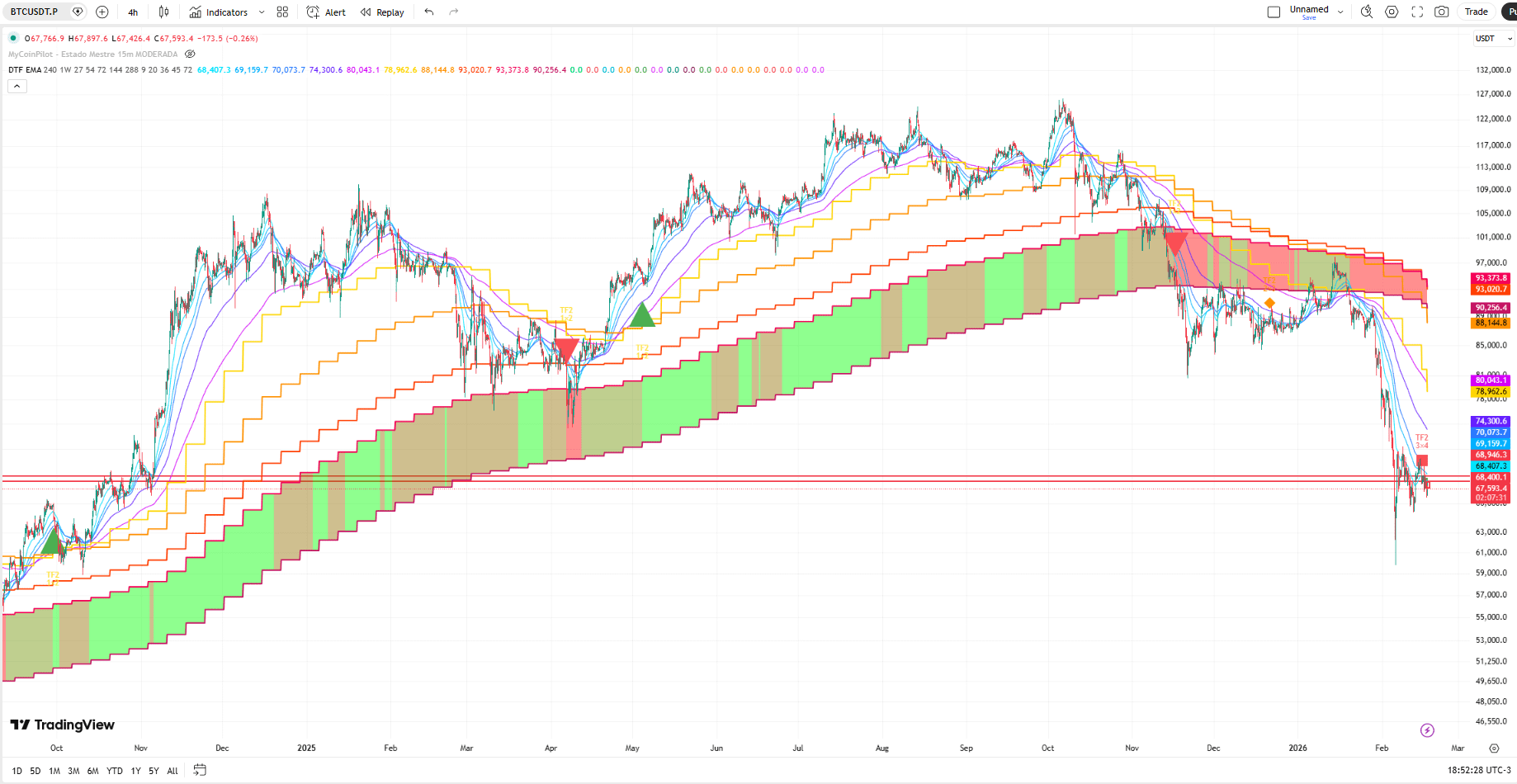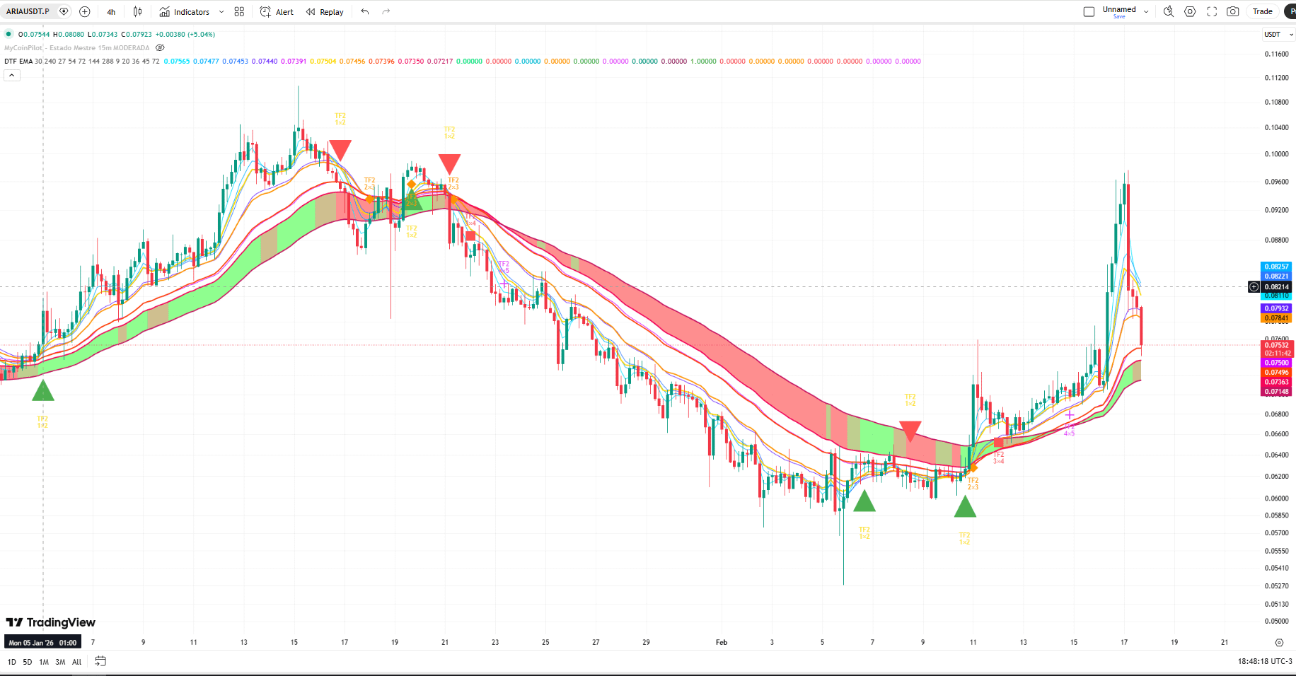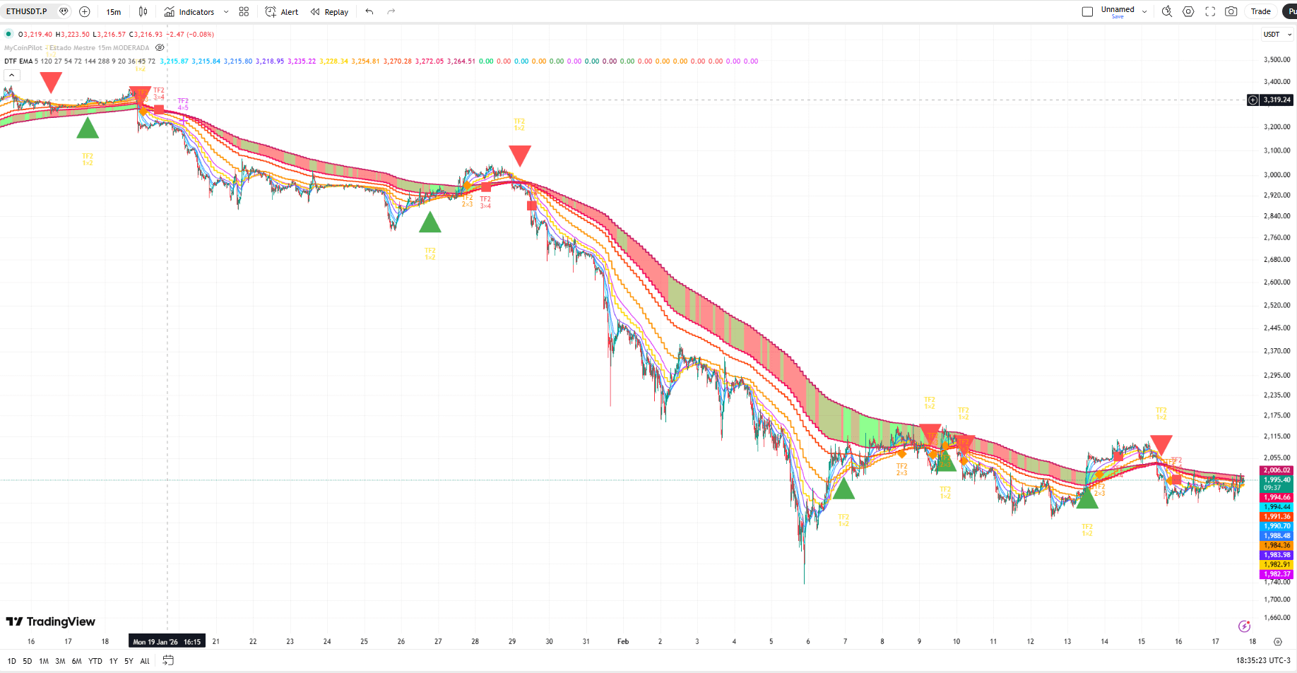 Ambos os timeframes utilizam múltiplas EMAs sequenciais, formando: