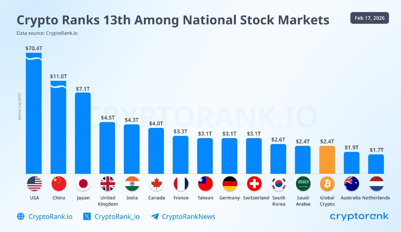 De acordo com o CryptoRank, a capitalização de mercado das criptomoedas gira em torno de US$ 2,4 trilhões, o que a coloca em pé de igualdade com algumas das maiores bolsas de valores nacionais do mundo.