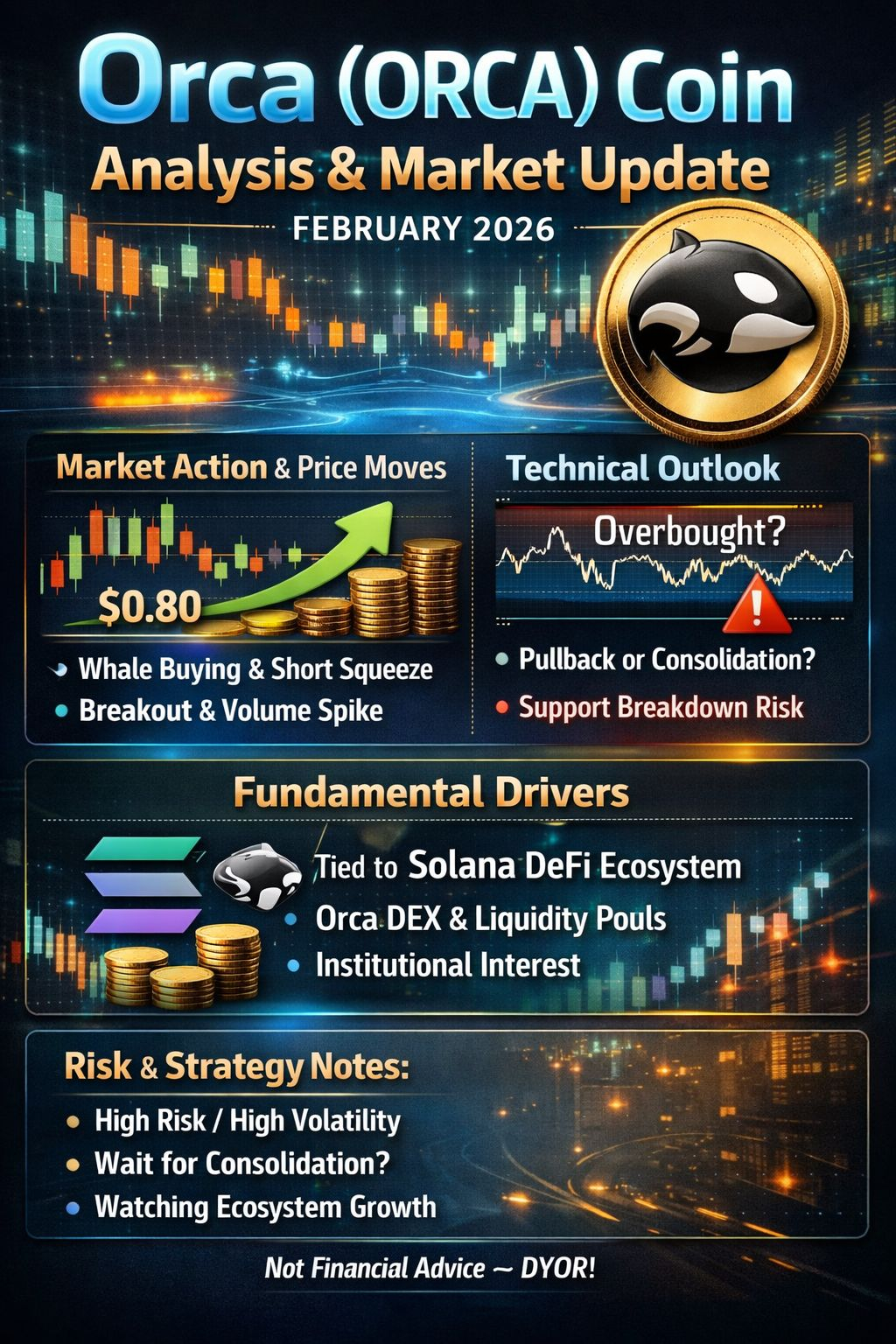 Orca (ORCA) continues to show heightened volatility in February 2026, reflecting renewed activity across the Solana DeFi ecosystem. After spending weeks consolidating near prior support, ORCA experienced a strong breakout fueled by rising volume and aggressive buyer participation. The move triggered short liquidations and pushed price into a fresh resistance zone.