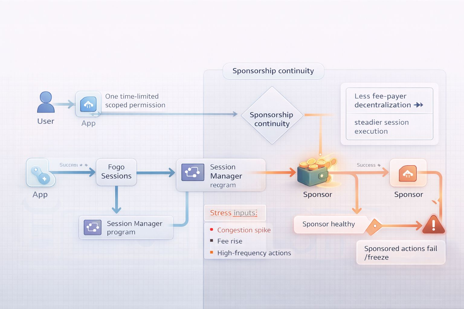 I do not treat sessions as a pure UX feature. I treat them as a reliability contract. Fogo Sessions are a promise that the app can keep acting on my behalf for a short time. The Session Manager program is the on chain place where that promise becomes real traffic. Under normal conditions, the promise is easy to keep. Under congestion, the promise has to be defended. That defense is not about nicer screens. It is about how sponsorship is controlled and how concentrated it becomes.