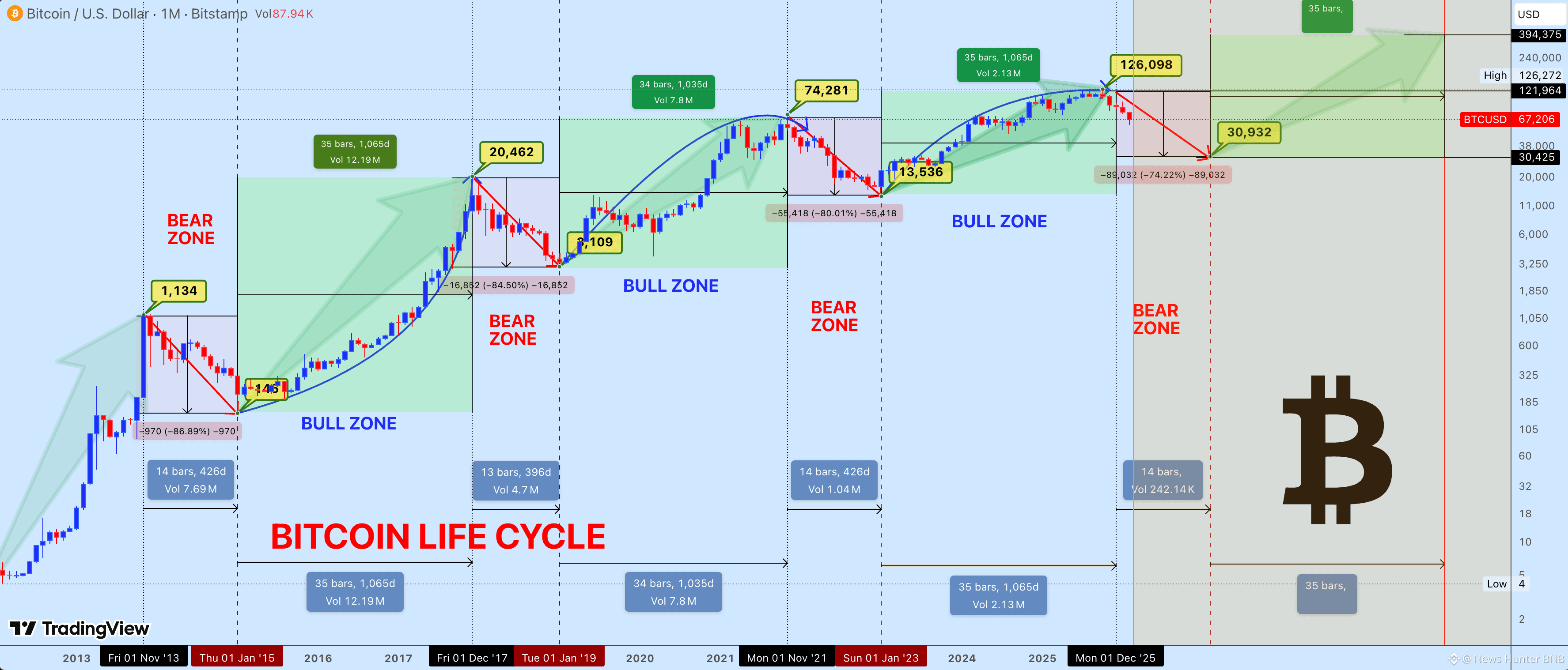 As the digital asset market matures, it becomes increasingly important to contextualize price action within Bitcoin’s established macro cycle framework. Historically, Bitcoin has demonstrated a repetitive sequence of expansion, distribution, contraction, and re-accumulation. Current price behavior continues to respect this broader structural rhythm with notable precision.