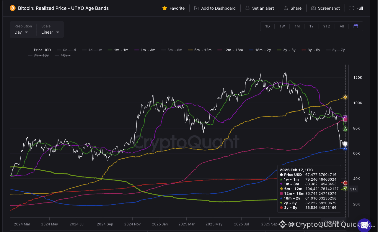 Realized Price – UTXO Age Bands reflects the average cost basis of different holder cohorts, allowing us to assess which segments of the market are currently under stress. This metric helps identify where selling pressure is coming from and whether the broader market structure remains intact.