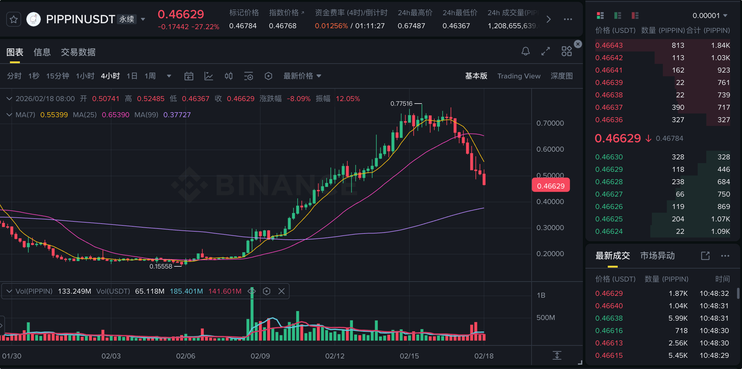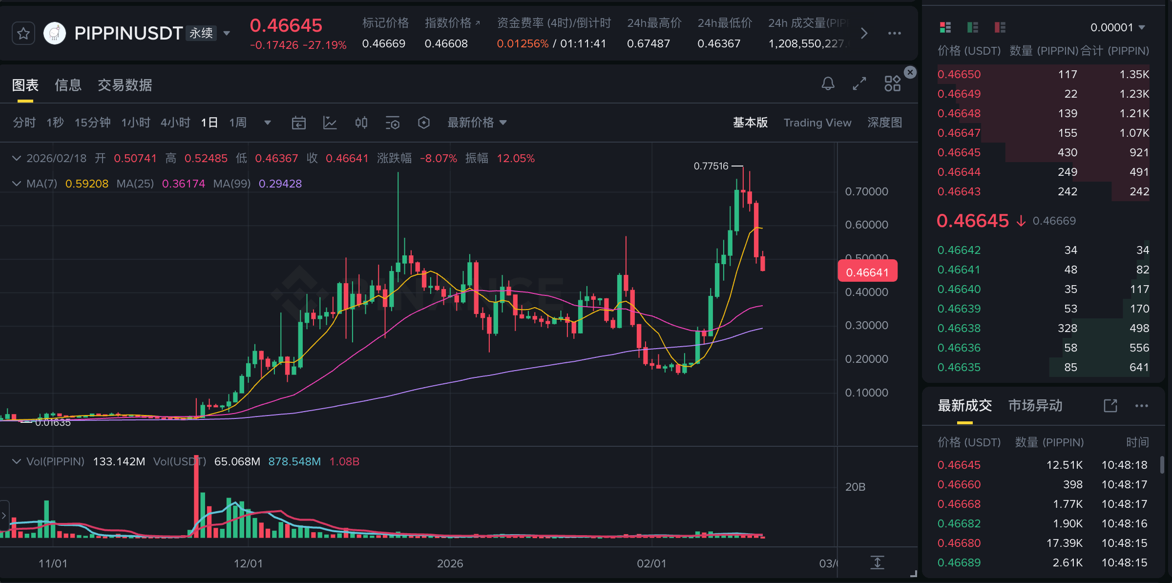 目前 $PIPPIN (Pippin) 正处于一个极其典型的 “高位派发+多头踩踏(Long Squeeze)” 的危险博弈阶段。结合当前的日线图、4小时图、社交媒体上的链上异动消息以及 0.01256% 的正向资金费率,以下是对 $PIPPIN 接下来走势的深度分析: