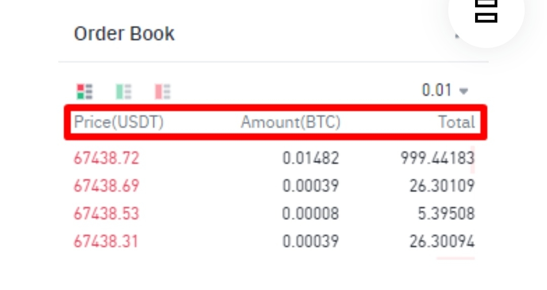 On Binance Web, the order book is located on either the left or right side of your trading interface (left side for Spot and Margin; right side for Futures). It looks like this: