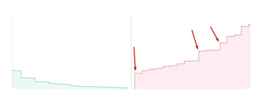 You’ll see two curves: one for bids (buy orders in green) and one for asks (sell orders in red). By analyzing these curves, traders can get a sense of where the market is more likely to move or spot "buy walls" or "sell walls" that might stop the price from moving past certain levels.
