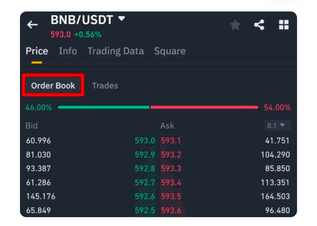 On the Binance App, the order book is located under your trading chart and looks like this:
