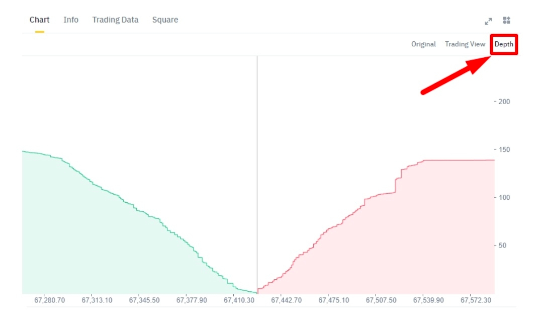 On Binance, you can find the depth chart at the top right corner of your chart interface. You can also use the Depth chart to check the current bid-ask spread of a particular market.