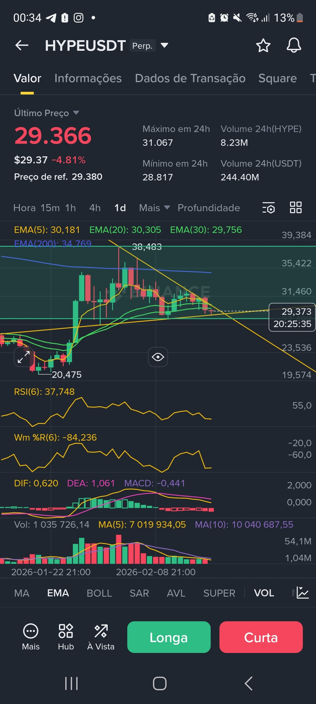* 1D (Diário): O ativo está em uma clara tendência de baixa após o topo em 38.483. O preço está atualmente abaixo das EMAs de curto prazo (5, 20, 30), indicando pressão vendedora predominante.