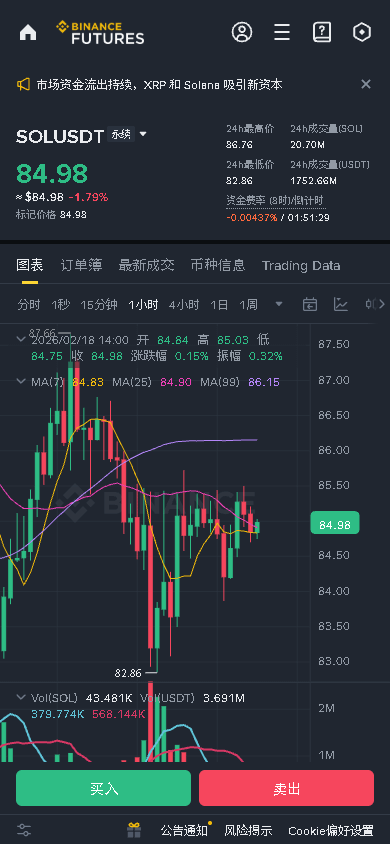 $SOL 1H级别价格在84.70-85.50窄幅震荡,形成三角收敛末端,即将选择方向。4H级别价格在EMA20(85.23)下方弱势盘整,但持仓量(OI)保持稳定,未随价格下跌而减少,暗示并非主力单边出货,而是多空博弈加剧。负资金费率表明空头情绪浓厚,一旦价格向上突破,可能引发轧空行情。