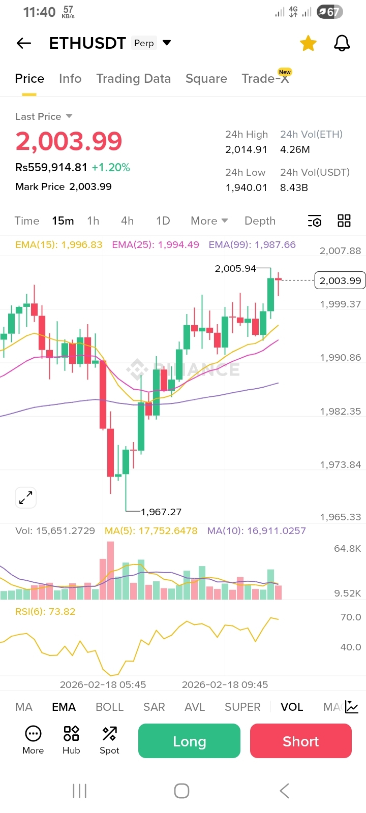 ETHUSDT perpetual futures are showing bullish intraday momentum, currently trading around 2,003.99 USDT, reflecting a +1.20% gain over the last 24 hours. Below is a structured breakdown of the technical outlook and a potential trading plan using EMA and RSI indicators.