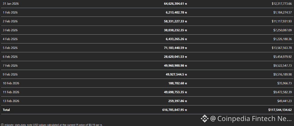 Recent PiScan migration statistics show a pause in daily mainnet transfers. Earlier in February, daily migration volumes were substantial, including 71.18 million PI on February 6 and 58.33 million PI on February 2. Those flows steadily expanded circulating liquidity. However, the most recent update shows migration activity cooling significantly, with the last recorded daily migration around 259,397 PI before activity effectively paused. In total, more than 616.7 million PI tokens have migrated to mainnet so far, representing roughly $117.5 million in value at current prices. That cumulative figure is significant, but the key variable now is flow direction, and it has slowed.