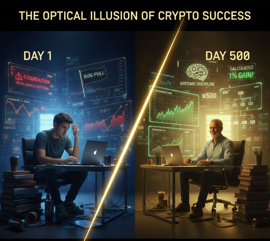 * Inflation of Risk: Seeing a Day 500 pro’s returns makes the mountain look too steep. To "catch up," beginners often over-leverage, leading to instant liquidation.