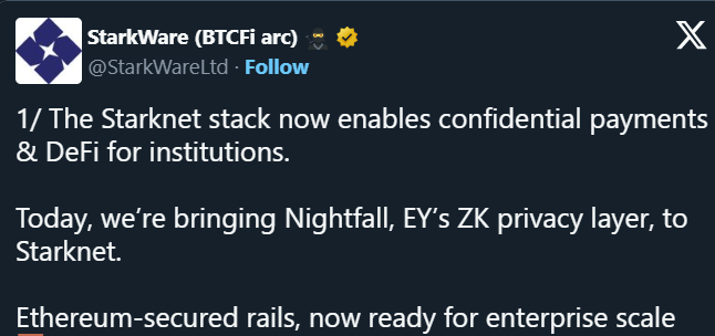Компания StarkWare объявила об интеграции уровня обеспечения приватности Nightfall от аудиторской фирмы «Большой четверки» Ernst & Young (EY) в свою L2-сеть Starknet.