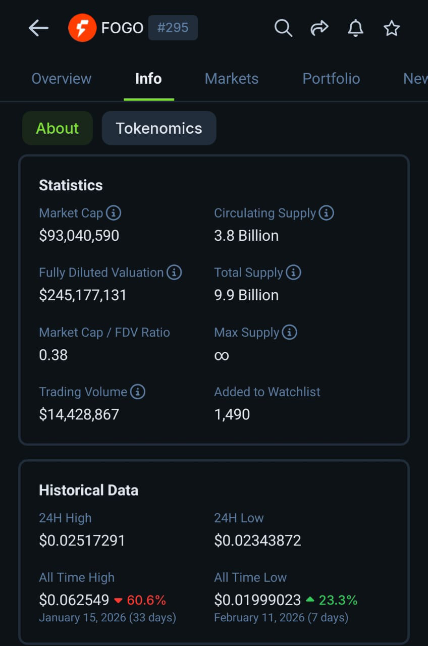 FOGO currently have 3.8 Billion circulating supply and about 9.9 Billion total supply. This means not all tokens already in market yet. Only small portion is active trading while big amount still locked or not released. When circulating supply is lower than total supply like this, sometimes it give strong price push because demand fighting over limited available coins.