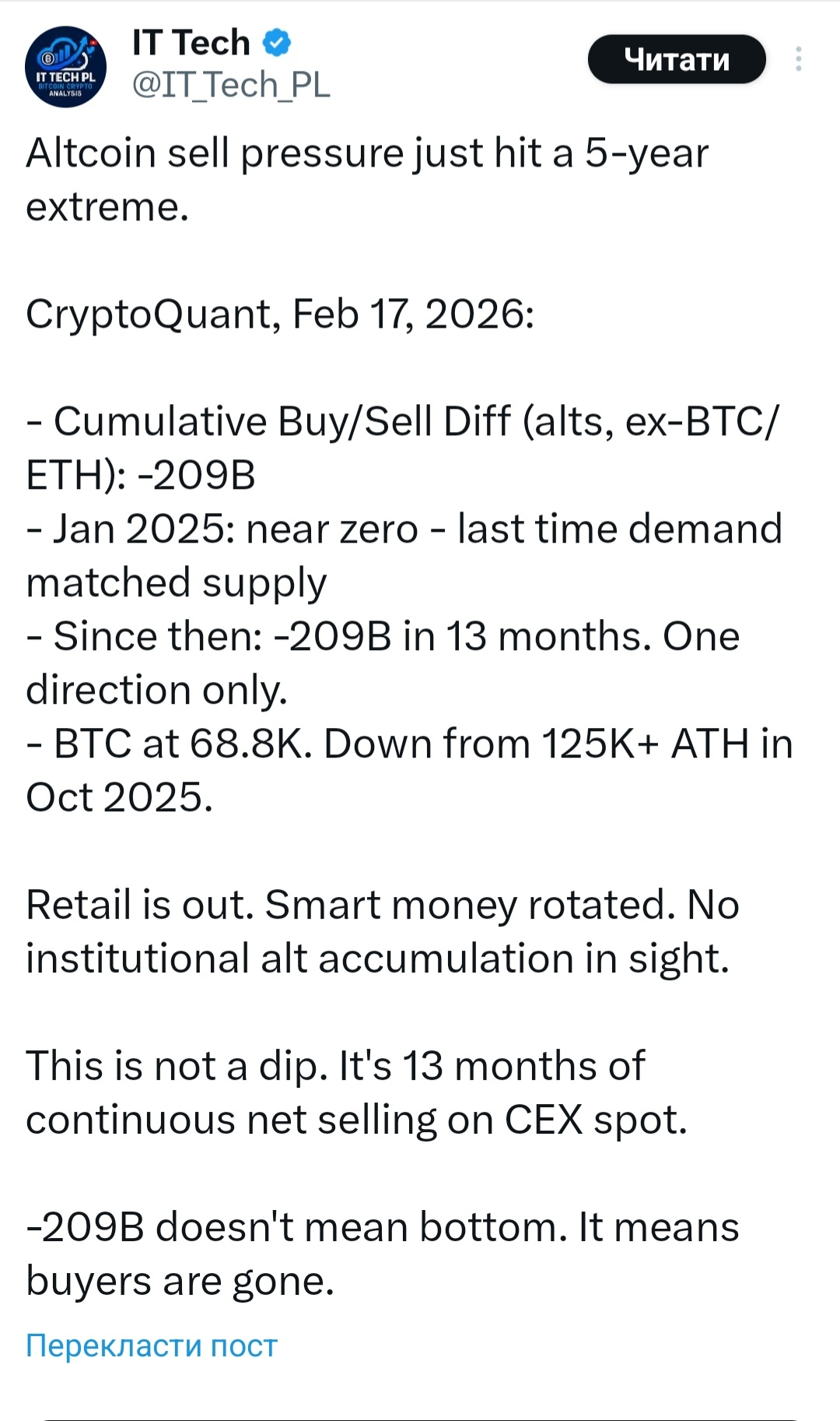 🔍 За даними CryptoQuant, кумулятивна різниця між покупками та продажами альткоїнів (без Ethereum) сягнула -$209 млрд.🤯 У січні 2025 року показник був біля нуля, а зараз — 13 місяців чистого відтоку капіталу з бірж. Це вказує на повну відсутність стійкого попиту, з високим обсягом депозитів альткоїнів (40-78 тис. транзакцій на день з липня 2025-го). Аналітики кажуть саме по собі -$209 млрд не сигнал дна, але це рекордний тиск продавців!