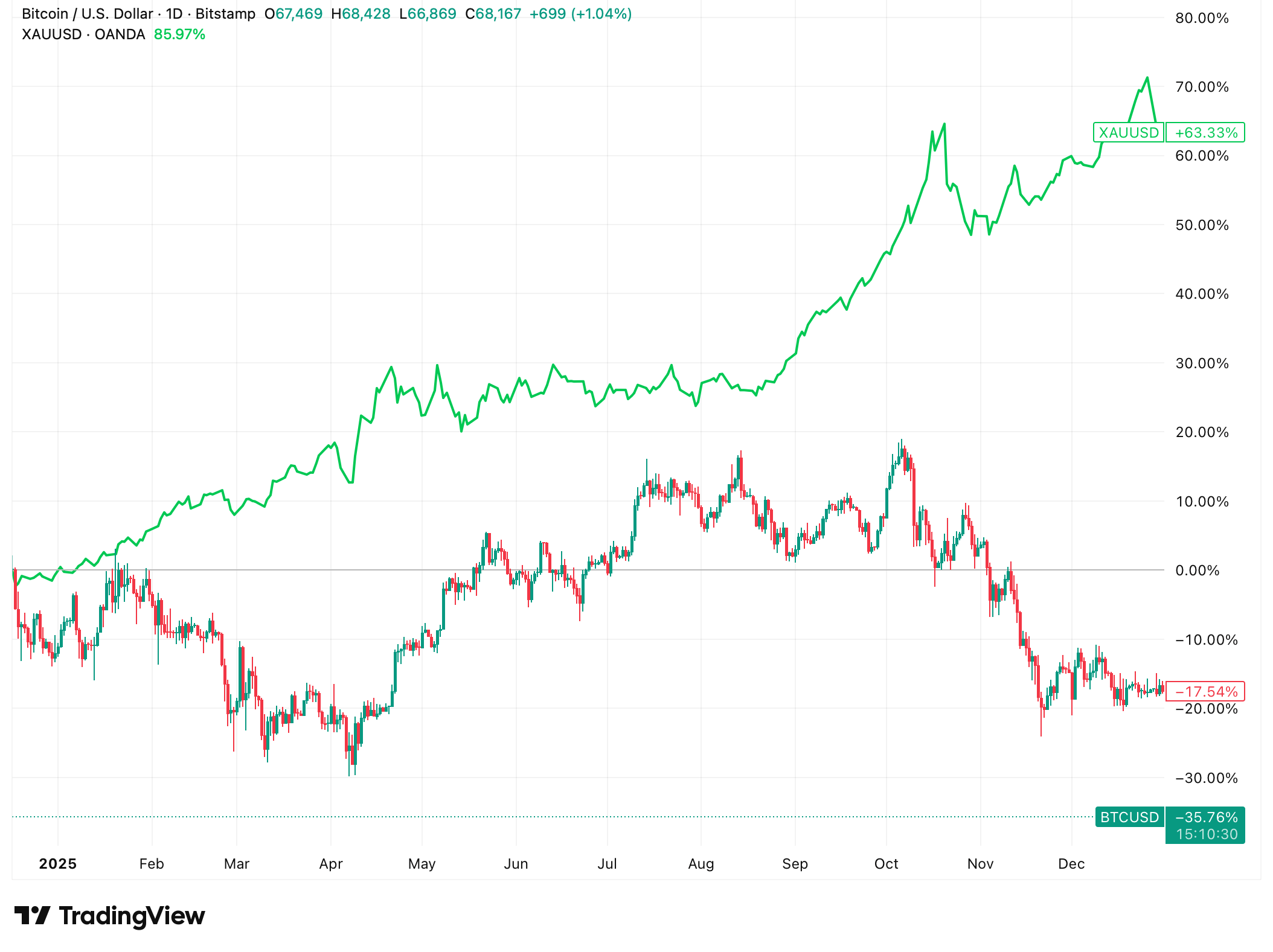 Outlook for 2026 remains mixed: gold maintains structural tailwinds, while Bitcoin depends on renewed liquidity and institutional catalysts.