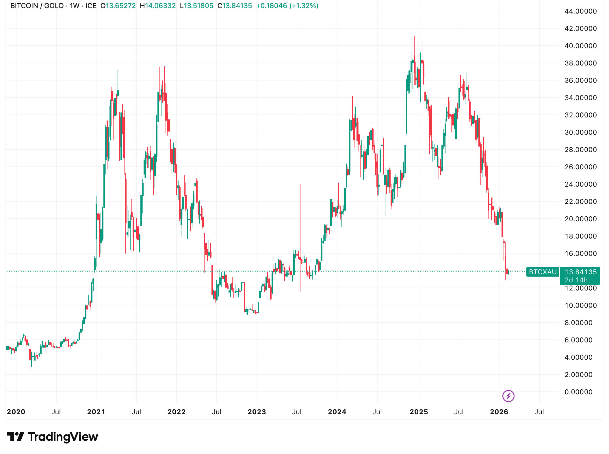 The BTC/Gold ratio, often used to gauge Bitcoin’s relative strength versus gold, stalled near prior highs but failed to break into sustained outperformance territory. The result was a year in which gold dominated the store-of-value narrative.