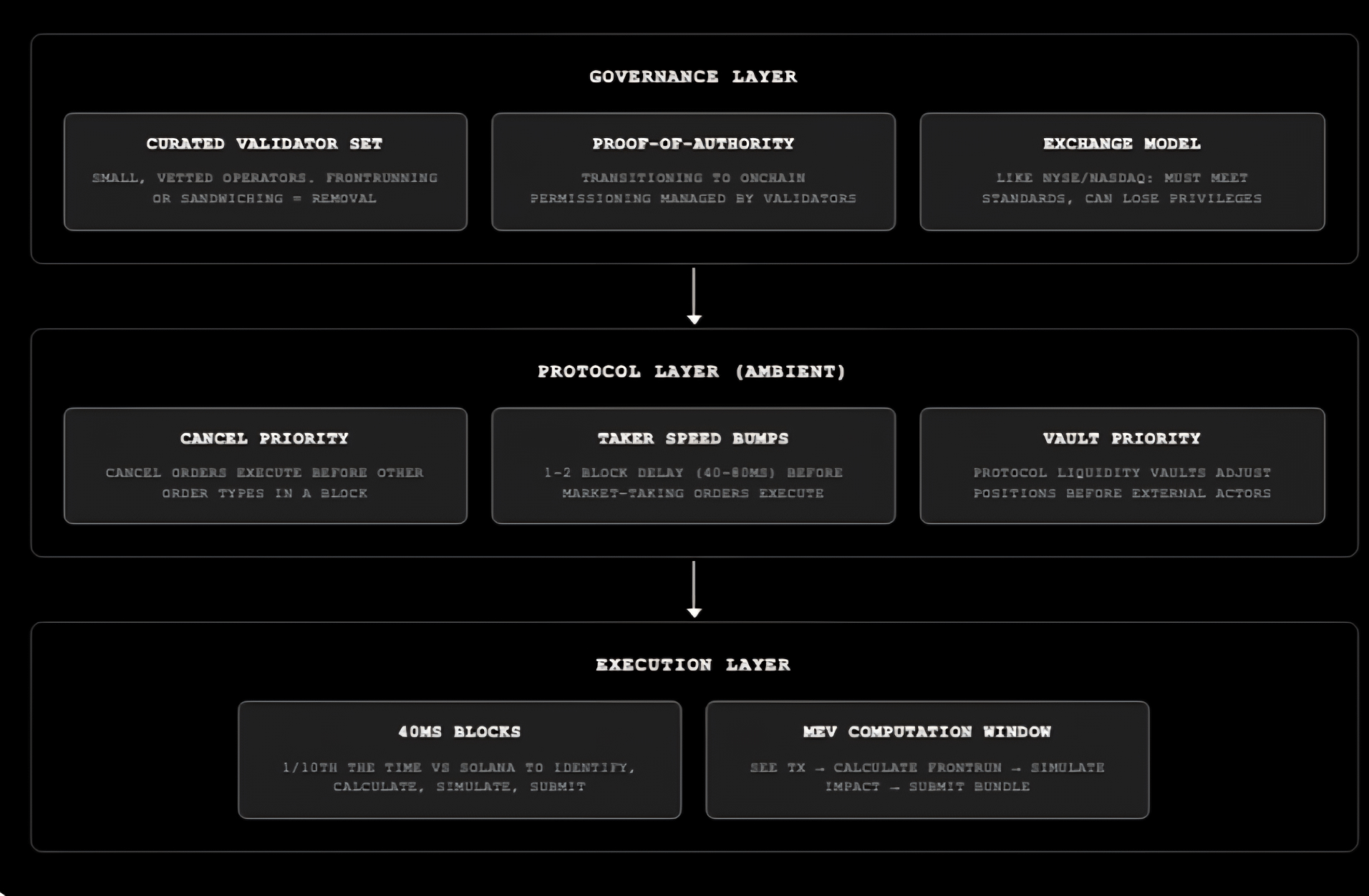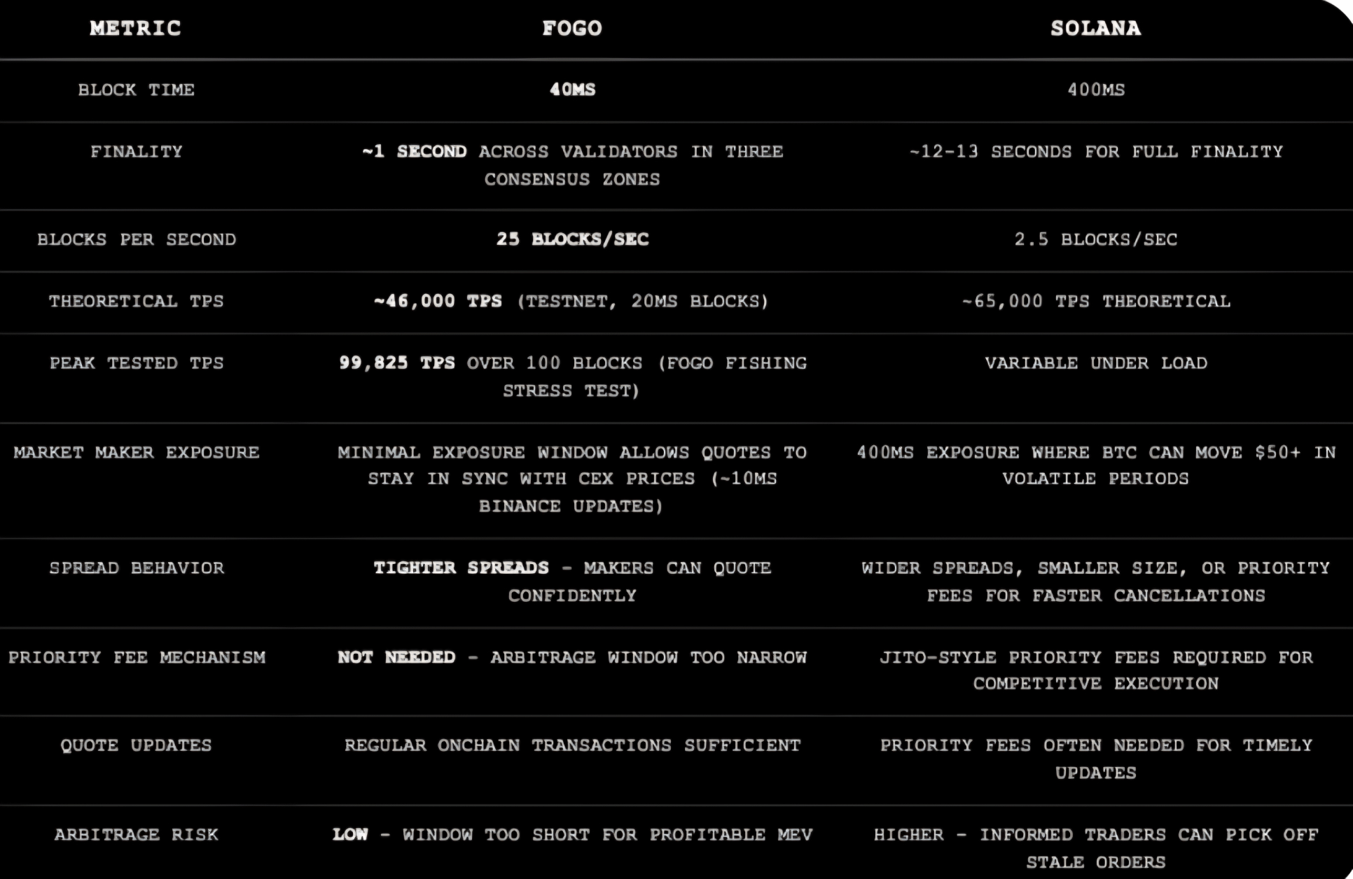With 40ms block times, compared to Solana’s ~400ms, the exposure window for market makers drops dramatically. In fast markets, even a few hundred milliseconds can mean getting picked off by arbitrageurs. Shorter blocks allow makers to update quotes more frequently, tighten spreads, and reduce defensive behavior like overpaying for priority fees.