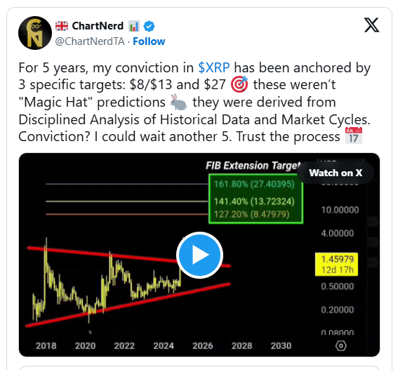 ChartNerd’s analysis frames XRP’s potential trajectory within a disciplined, data-driven context. Investors may monitor the $8, $13, and $27 targets as benchmarks for market behavior over the next several years. The convergence of independent institutional forecasts with historical Fibonacci levels strengthens confidence in these reference points.