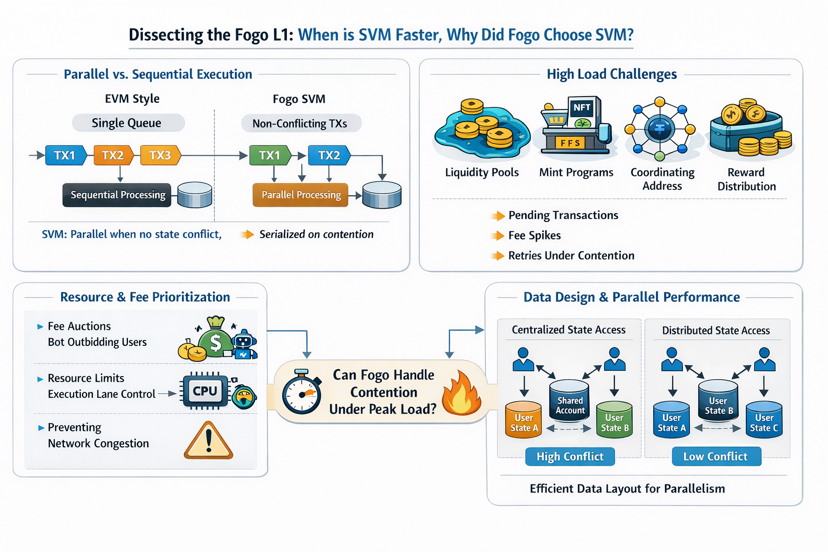 Fogo real challenge is to turn SVM into durable speed, not demo speed, by controlling state contention, designing to avoid hotspot, pricing resource accurately so bot cannot monopolize lane, and pushing the ecosystem toward data layout that is friendly to parallel execution. When the market heats up and everything floods into Fogo, will SVM keep the network’s rhythm calm, or will it expose the hotspot that speed has been hiding for too long.