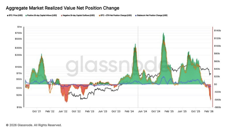 Historically, extreme capital outflow events tend to cluster near emotional exhaustion phases — not at euphoric highs. In 2018. In 2022. Sharp outflows coincided with late-stage fear, when positioning was already heavily defensive and most marginal sellers had acted.