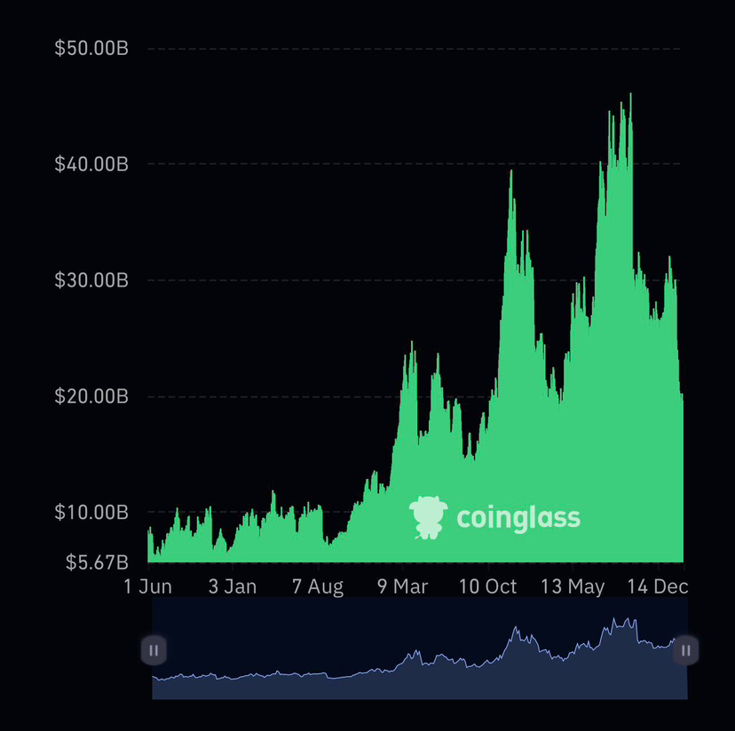 The open interest is high indicating that the market is saturated with leveraged bets on both sides. That can accelerate price, but it also renders the market weak, inoculation forced closing has a domino effect. When the open interest is collapsing then it is usually signaling that the market is paying off debt and this may be detrimental in the short term but is more healthy in the long term.